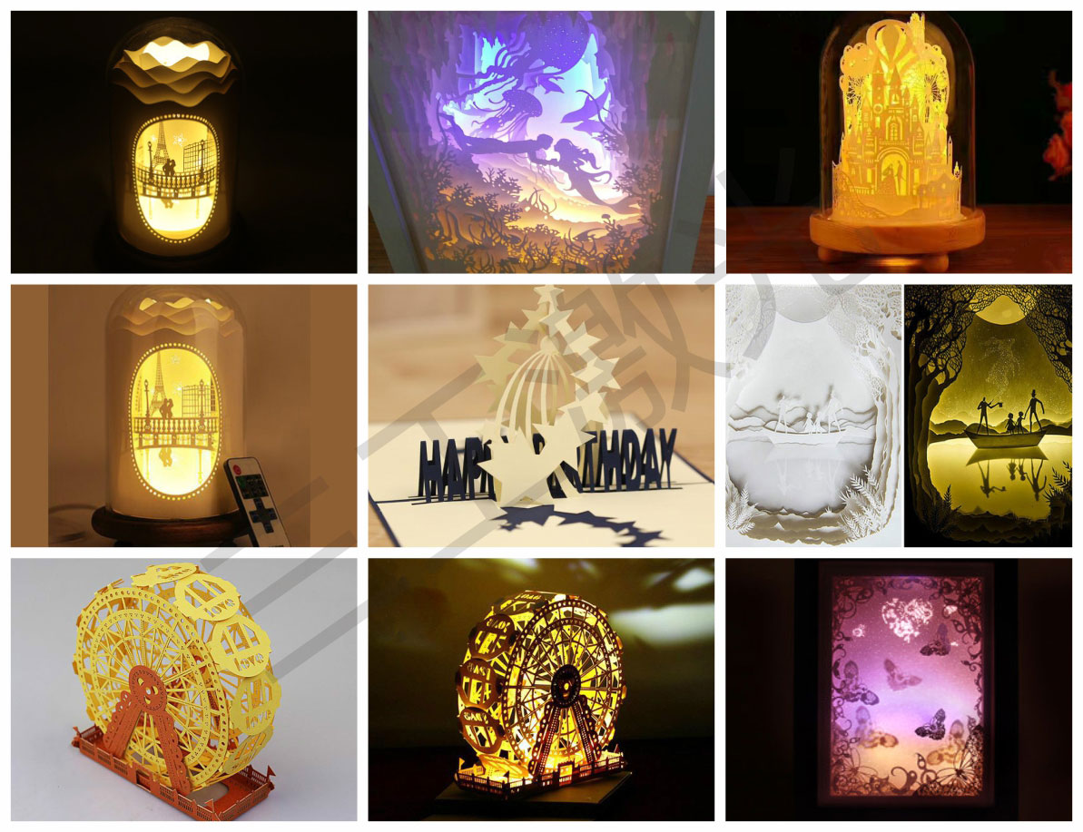 該設(shè)備適用于賀卡等各種紙質(zhì)材料的雕刻、切割、鏤空制作。
