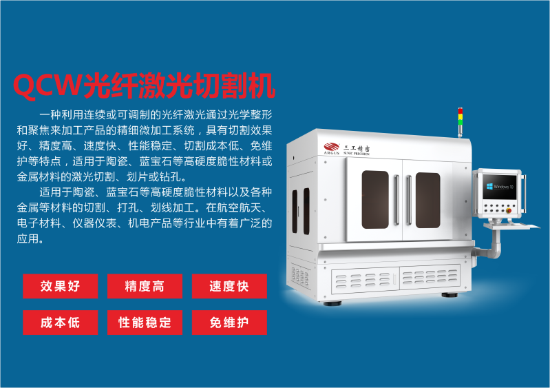 一種利用連續(xù)或可調制的光纖激光通過光學整形和聚焦來加工產品的精細微加工系統(tǒng),具有切割效果好、精度高、速度快、性能穩(wěn)定、切割成本低、免維護等特點,適用于陶瓷、藍寶石等高硬度脆性材料或金屬材料的激光切割、劃片或鉆孔。適用于陶瓷、藍寶石等高硬度脆性材料以及各種金屬等材料的切割、打孔、劃線加工。在航空航天、電子材料、儀器儀表、機電產品等行業(yè)中有著廣泛的應用。