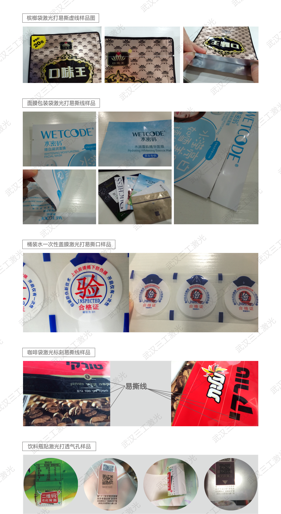 武漢三工激光是國(guó)內(nèi)率先針對(duì)薄膜包裝行業(yè)提出激光代替機(jī)械加工工藝的企業(yè),專為薄膜易撕線、定量透氣孔而設(shè)計(jì)與開發(fā)的。與傳統(tǒng)的機(jī)械齒輪壓孔相比速度更快,孔徑孔距大小可調(diào)更加均勻,可以實(shí)現(xiàn)任意方向任意形狀易撕孔(線)標(biāo)刻。激光工藝制作是一種瞬間高溫處理使孔周圍熱融保護(hù),因此完全解決了后期熱收縮后出現(xiàn)的斷裂現(xiàn)象,在手感上也非常平滑,在感官上給客戶一種新的體驗(yàn)。激光易撕線和透氣孔的諸多優(yōu)勢(shì)我們前面已經(jīng)講到過很多,再次不做贅述,下面一起來看一下我們易撕線激光打孔劃線機(jī)做的不同行業(yè)以及材料的樣品吧!